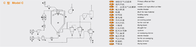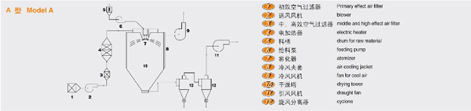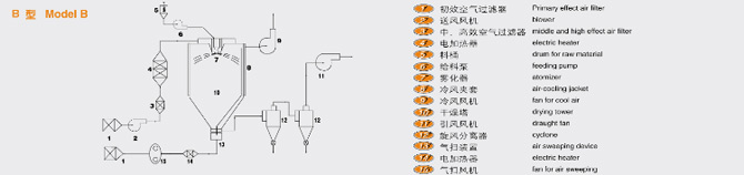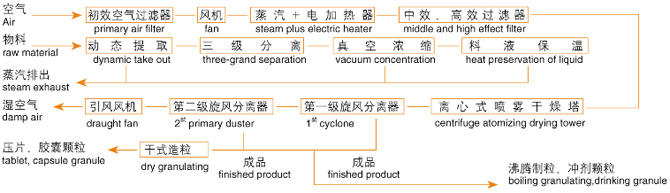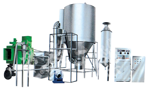 該機采用全封閉形式,所有部件均采用不銹鋼制造,配有三級凈化裝置,過濾后的空氣達十萬級要求。筒體與頂部裝有冷壁裝置,使壁溫<80℃,干燥塔內裝有氣刷掃塔裝置。經該機干燥后的中藥浸膏粉,不會出現焦化變質現象,大大增加了收粉率(95%以上),而且不會產生混藥現象和粘壁現象。