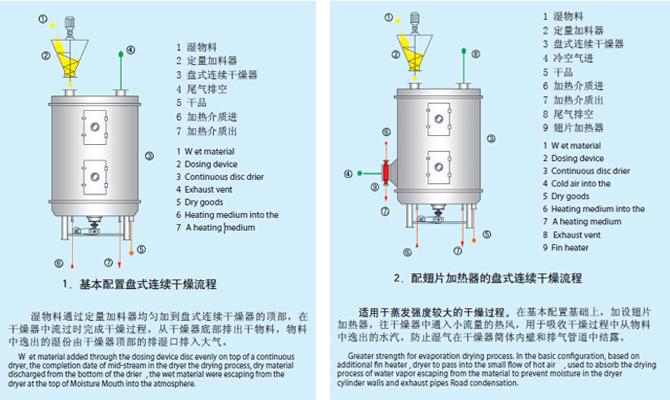 濕物料自加料器連續地加到干燥器上部第一層干燥盤上,帶有耙葉的耙臂作回轉運動使耙臂作回轉運動使耙葉連續地翻抄物料。物料沿指數螺旋線流過干燥盤表面,在小干燥盤上的物料被移送到外緣,并在外緣落到下方的大干燥盤外緣,在大干盤上物料向里移動并從中間落料口落如下一層小干燥盤中。大小干燥盤上下交替排列,物料得以連續地流過整個干燥器。中空的干燥盤內通入加熱介質,加熱介質形式有飽和蒸汽、熱水和導熱油,加熱介質由干燥盤的一端進入,從另一端導出。已干物料從^后一層干燥盤落到殼體的底層,^后被耙葉移送到出料口排出。濕份從物料中逸出,由設在頂蓋上的排濕口排出,真空型盤式干燥器的濕氣由設在頂蓋上的真空泵口排出。從底層排出的干物料可直接包裝。通過配加翅片加熱器、溶劑回收冷凝器、袋式除塵器、干料返混機構、引風機等輔機,可提高其干燥的生產能力,干燥膏糊狀和熱敏性物 料,可方便地回收溶劑,并能進行熱解和反應操作。