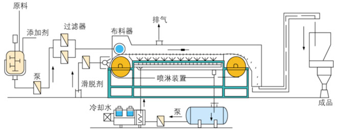 該機由液體變固體粒狀,主要是通過造粒模頭造粒,采用回轉式鋼帶連續進行,通過噴淋水冷卻定型。