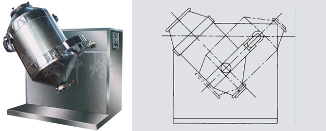 裝料的筒體在主動軸的帶動下,作周而復始的平移、轉動和翻滾等復合運動,促使物料沿著筒體作三向復臺運動,從而實現多種物料的互相流動、擴散、積聚、摻雜.以達到均勻混合的目的。