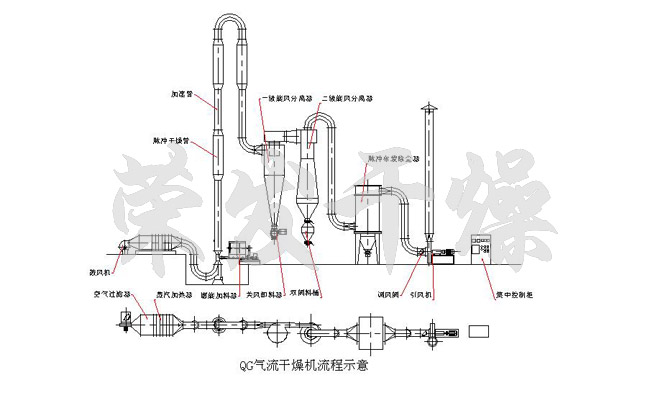 濕物料經(jīng)輸送機(jī)與加熱后的自然空氣同時(shí)進(jìn)入干燥器,二者充分混合,由于熱質(zhì)交換面積大,從而在很短的時(shí)間內(nèi)達(dá)到蒸發(fā)干燥的目的。干燥后的成品從旋風(fēng)分離器排出,一小部分飛粉由旋風(fēng)除塵器或布袋除塵器得到回收利用,Q型氣流干燥機(jī)是負(fù)壓操作,物料不經(jīng)過(guò)風(fēng)機(jī),Q系列為基本型。(多年來(lái),經(jīng)過(guò)不斷地改進(jìn)提高,氣流干燥機(jī)已經(jīng)發(fā)展成四大系列,更加能夠滿足客戶多方位的需求。)
